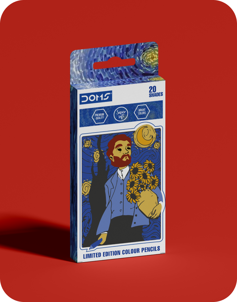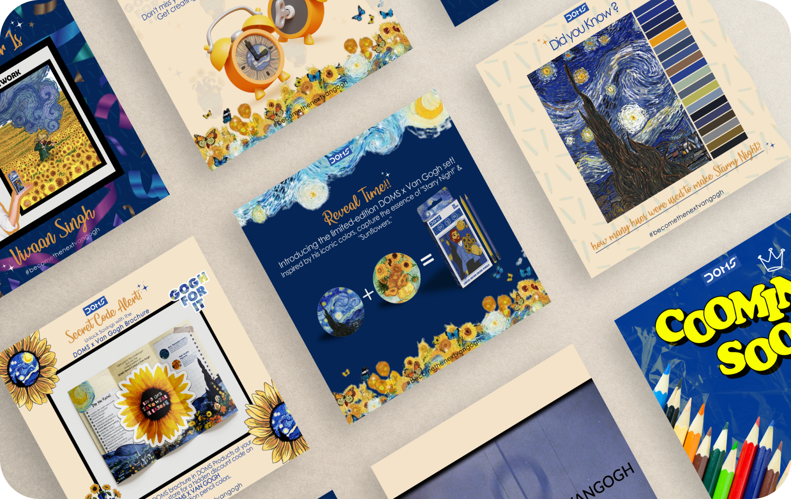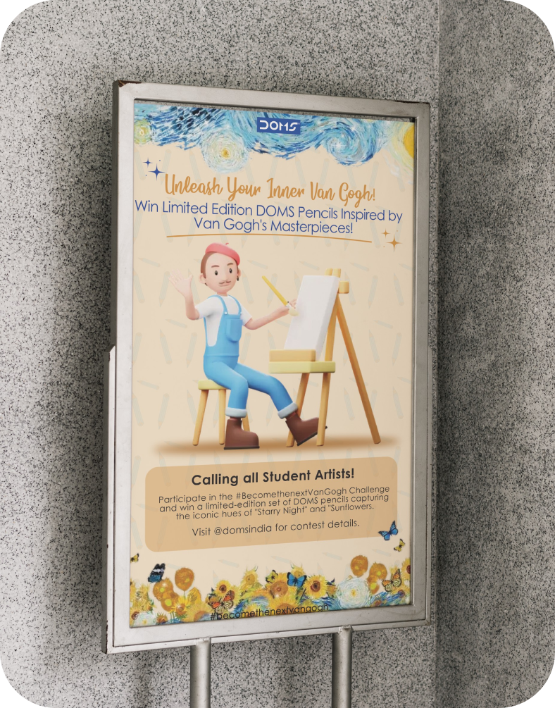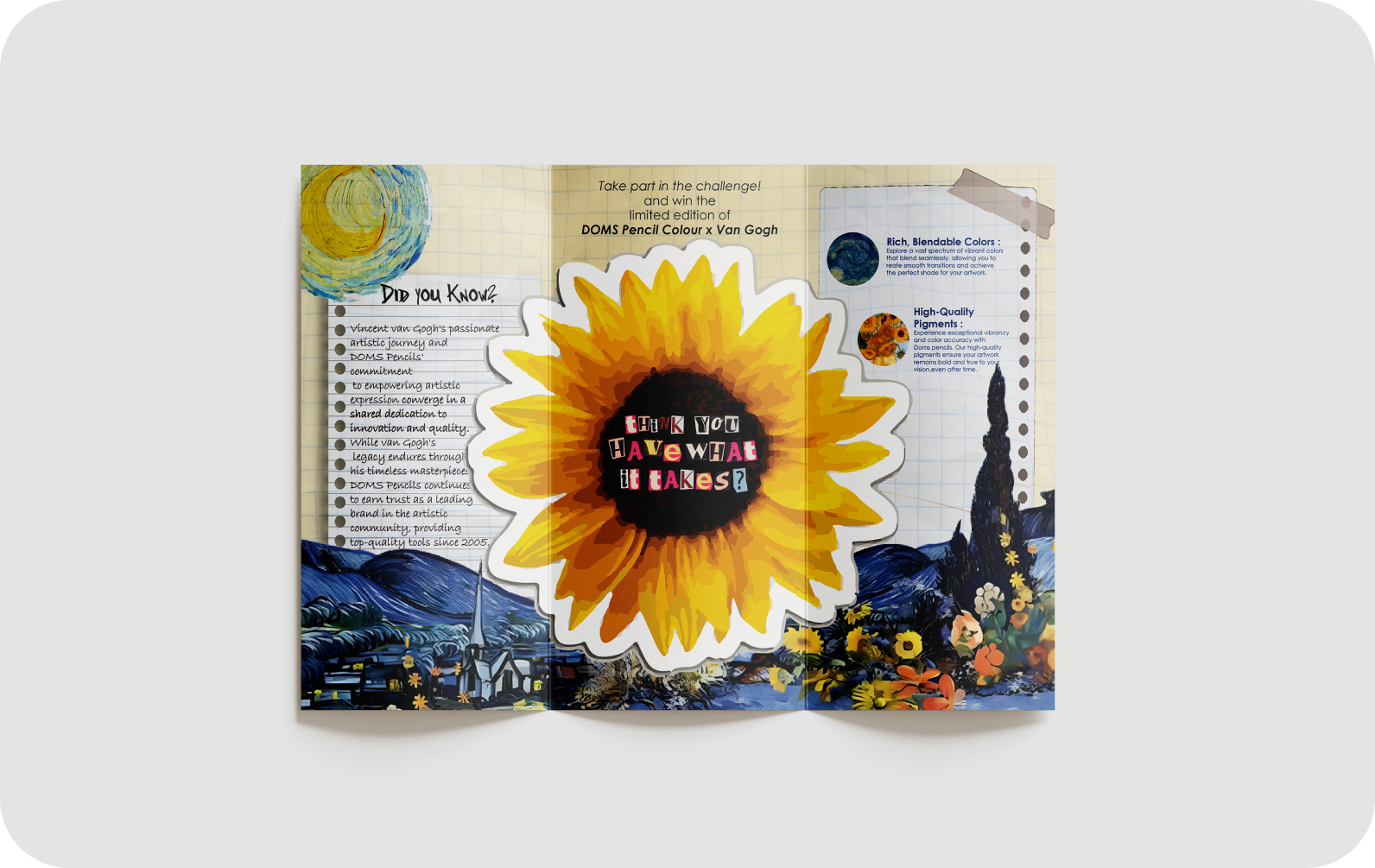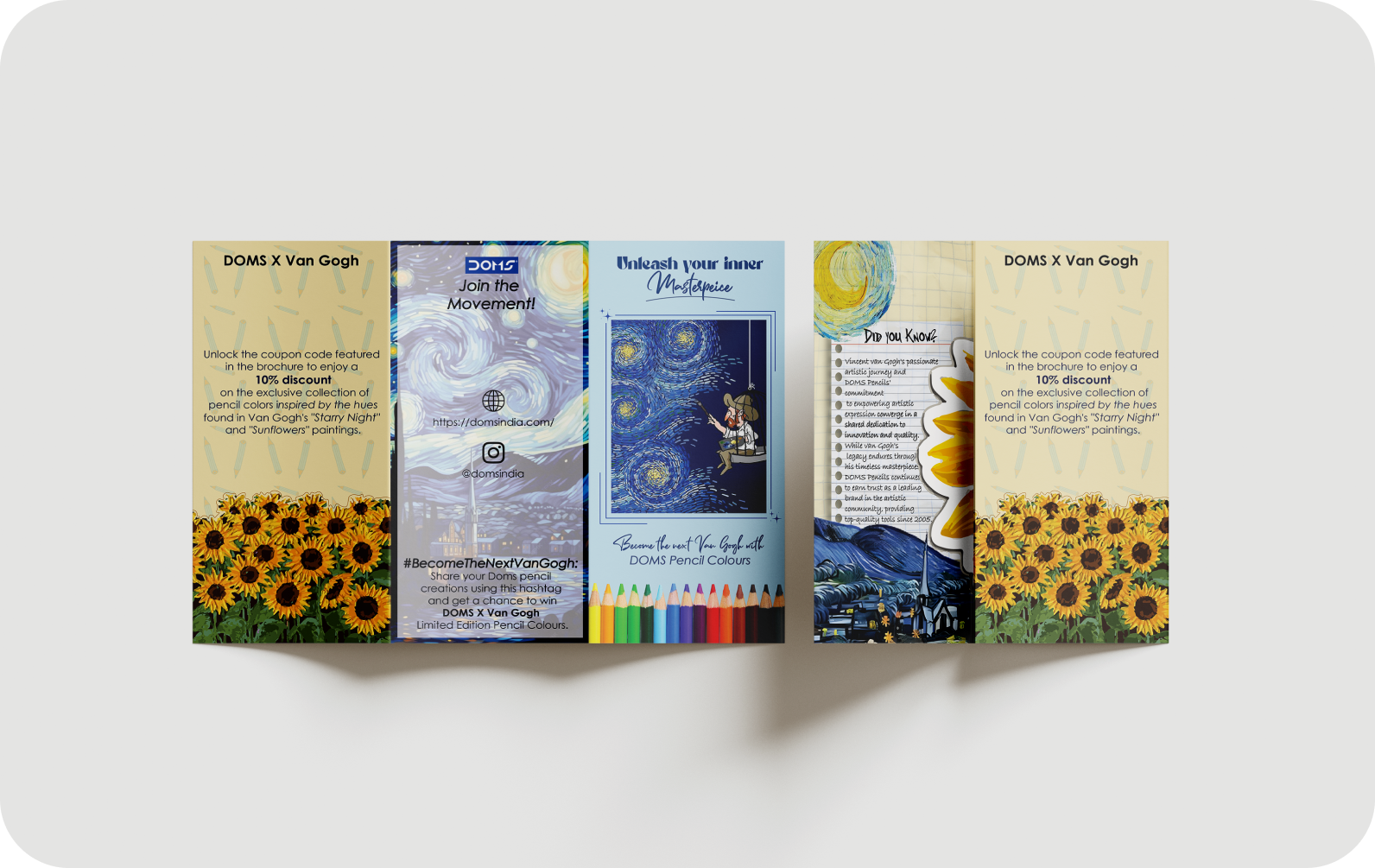 Inspired by the iconic works of Vincent van Gogh, this academic project aimed to spark creativity in young artists. The campaign, centered around a Van Gogh-themed art competition, encouraged participants to explore their artistic potential. As part of this project, I contributed to the design of the limited-edition DOMS pencil color packaging, drawing inspiration from the vibrant hues of “Starry Night” and “Sunflowers.” Additionally, I designed various marketing materials, including brochures, posters, and social media graphics, to promote the competition and engage the target audience.
